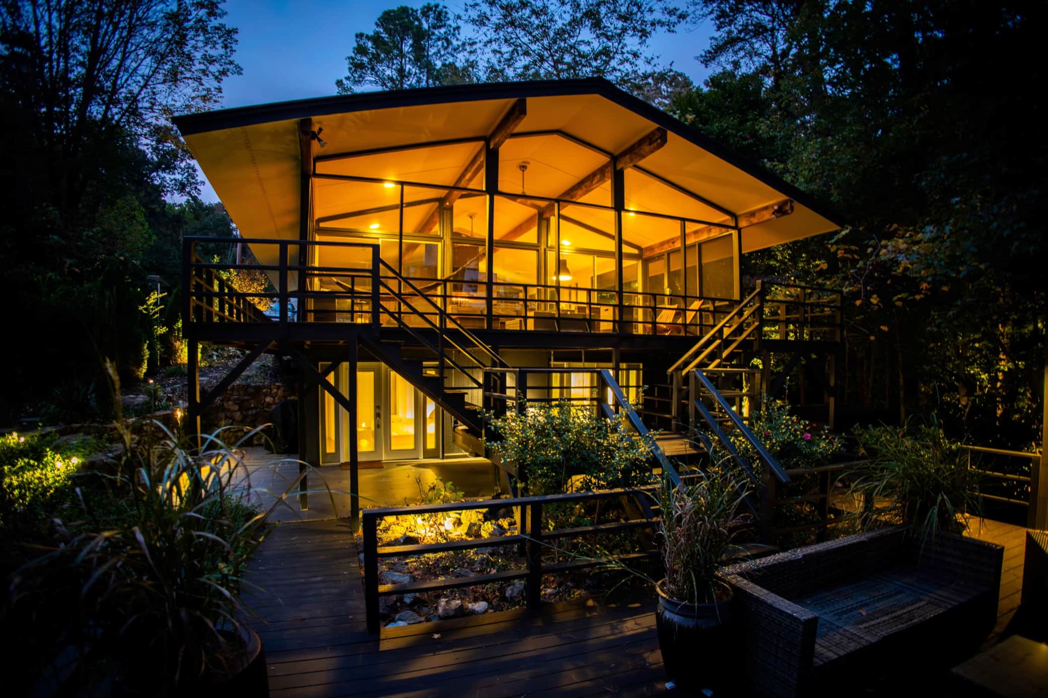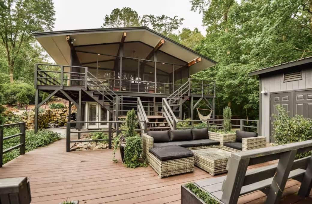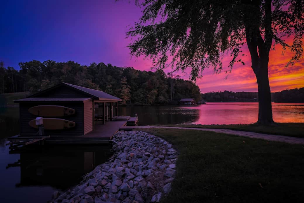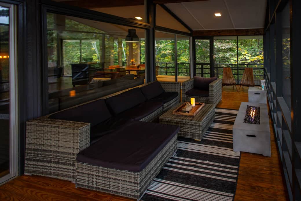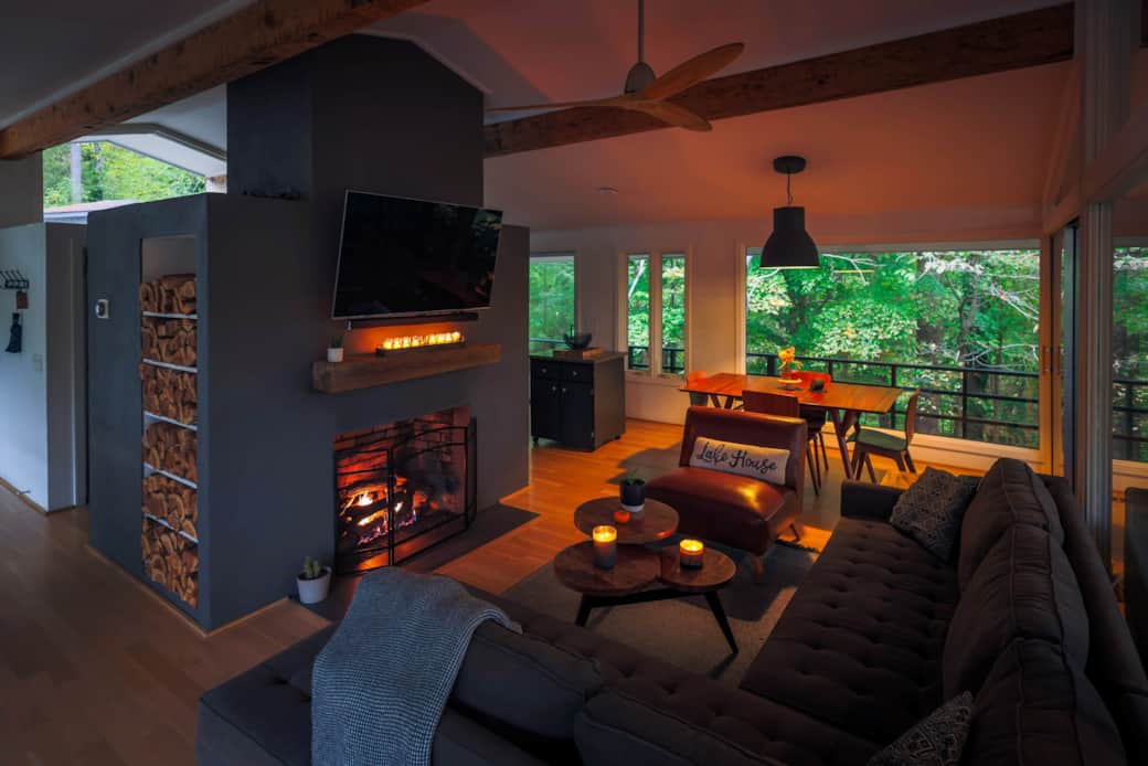 The Glass House provides a very open feel to nature with all of the windows looking out over the lake and nature! Gas logs inside to cozy up during the winter months! The screened porch off of the living room offers beautiful lake views while lounging in the hammocks! The perfect spot for morning coffee! This super cool design offers about 1300 square feet of living area inside and even more outdoor living area! Covered slate patio with hanging bed, deck space with furniture, outdoor shower beside the hot tub, patio with outdoor firepit (wood provided) and a full boat dock! I have provided two kayaks and two paddle boards for my guests. This vacation getaway is set up for guests to enjoy all seasons! There is not a time of year that disappoints me!